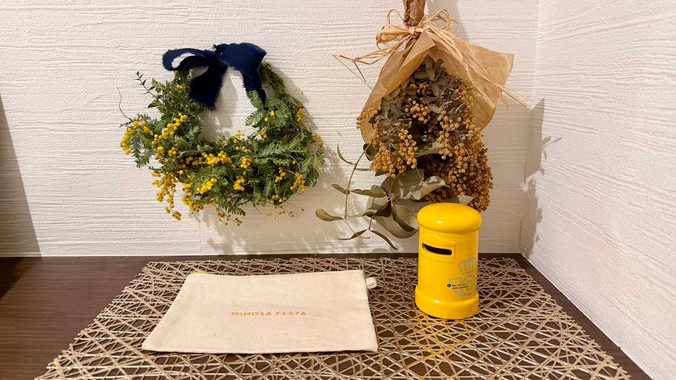 ミモザのハーフリース、スワッグ、イエローポスト、ミモザフェスのポーチの4つのアイテムを設置しています。いろんな黄色が感じられる春を予感させるイメージにしています。