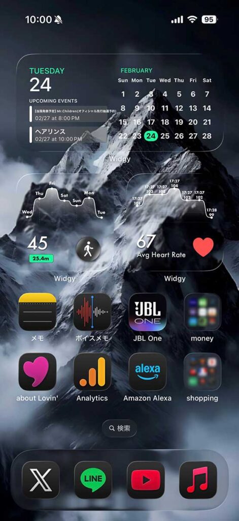 Widgyは背景画像を変更すると、対応した透過背景を生成してくれます。ホーム画面4~6ページ目は山に合わせてタイトルをカスタマイズしていますが、写真を変更したときにレイアウトが左右されない汎用バージョンも作成しておきました。中央位置にタイトルが配置されるシンプルなものですが、どんな写真がきてもバランスよく表示できます。